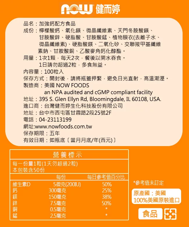 NOW健而婷-黃金六效 加強鈣配方食品(100顆-瓶)